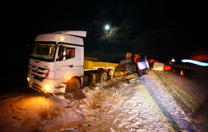 Bozca kavşağında, yolun kayganlaşmasından dolayı sürücüsünün hakimiyetini yitirdiği 06 EC 9777 plakalı tır orta refüje devrildi. Tırın dorsesindeki iki traktör yola savruldu. Bir süre trafiğe kapalı kalan yol, traktörlerin kaldırılmasının ardından yeniden ulaşıma açıldı.