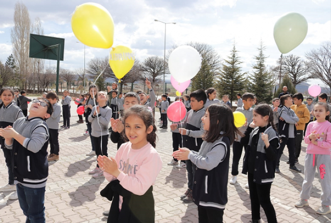 Kayseri'nin Sarıoğlan ilçesinde öğrenciler, "Balonlar gökyüzüne umutlar geleceğe'' temalı etkinlik düzenledi.