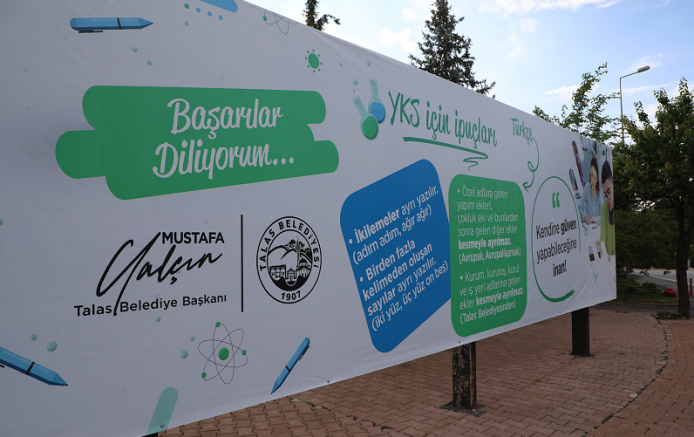 Talas Belediye Başkanı Mustafa Yalçın, yaklaşan Yüksek Öğretim Kurumları Sınavı (YKS) öncesi ilçenin çeşitli bölgelerinde yer alan açık hava reklam panolarında, sınava girecek adaylara hem başarılar diledi hem de çeşitli konularda ipuçları verdi.