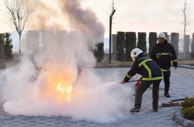 Seminerin ardından tatbikat gerçekleştirildi ve çalışanlar binayı tahliye ederek toplanma alanında bir araya geldi. Sıvı, katı ve gaz halindeki maddelerle çıkabilecek yangınlar ve nasıl müdahale edilebileceği uygulamalı olarak anlatıldı.