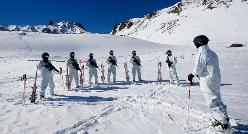 Tim, kayak takımlarını giyerek silahlı ve tam teçhizatlı şekilde yaklaşık 1000 metre dağ kayağı da yapıyor.