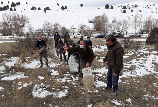 Kayseri Doğa Koruma ve Milli Parklar Şube Müdürlüğü ekipleri, yem bulmakta güçlük çeken yaban hayvanlarına destek olmak için Pınarbaşı'nda ilçe av komisyon üyelerinin de katılımıyla doğaya yem bıraktı.