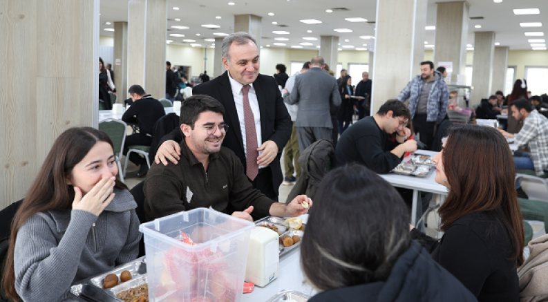 Öğrenci yemekhanesinde öğrenciler ile bir araya gelen Rektör Prof. Dr. Fatih Altun, yemek öncesi masaları tek tek dolaşarak öğrenciler ile sohbet etti.