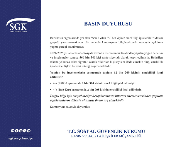 "2021-2025 yılları arasında Sosyal Güvenlik Kurumumuz tarafından yapılan yoğun denetim ve incelemeler sonucu 560 bin 540 kişi, sahte sigortalı olarak tespit edilmiştir. Belirtilen rakam, yalnızca sahte sigortalı olarak bildirilen kişi sayısını ifade etmekte olup, emeklilik iptallerine ilişkin bir veri niteliği taşımamaktadır." ifadelerine yer verildi.