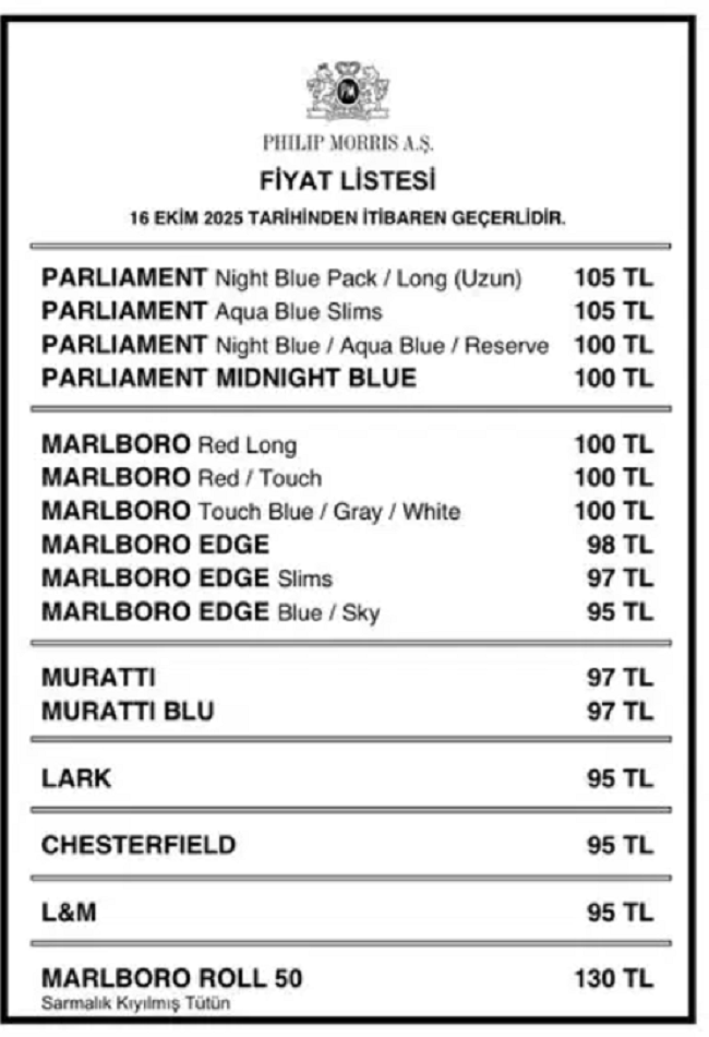 Yeni fiyat listesine göre, en düşük fiyatlı sigara artık 95 TL’den satılıyor. Diğer ürünlerde ise paket fiyatlarının 100 ila 105 TL arasında değiştiği görülüyor.
