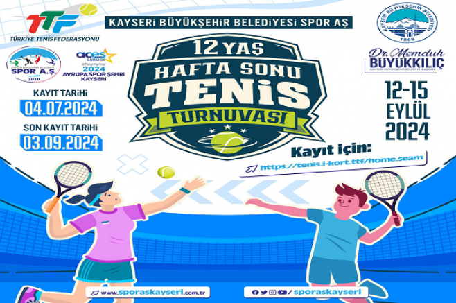 Kayseri Büyükşehir Belediyesi Spor A.Ş.’nin ev sahipliğinde Türkiye Tenis Federasyonu (TTF) tarafından düzenlenecek Ulusal 12 Yaş Hafta Sonu Tenis Turnuvası’na kayıtlar sürüyor. Recep Tayyip Erdoğan Millet Bahçesi Tenis Kortlarında lisanslı sporcular arasında 12-15 Eylül 2024 tarihlerinde gerçekleşecek turnuvaya son kayıt tarihi 3 Eylül Salı 2024 olarak belirlendi.