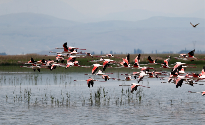 Sazlığın ortasında yer alan Yay Gölü kıyılarını üreme alanı olarak kullanan flamingolar, farklı bölgelerdeki tatlı ve tuzlu su birikintilerinde besleniyor.