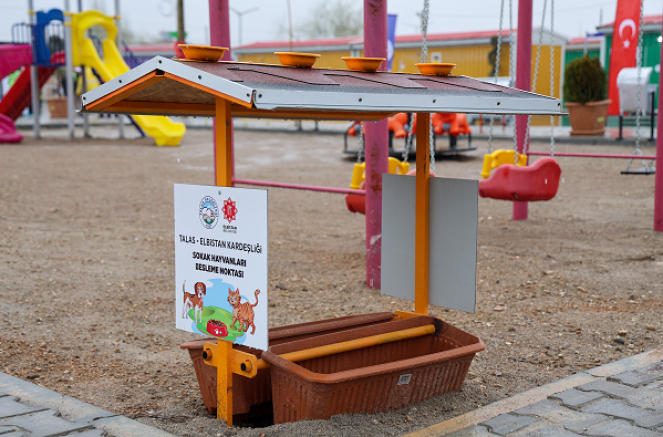 300 konteynerlik "Talas Kent Yaşam Alanı"nda hayvan besleme ünitesi yerleştiren belediye, kedi, köpek ve kuşların yiyeceğe ulaşmasını kolaylaştırdı.