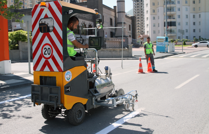 Talas Belediyesi, şehir içi yol çizgi uygulamaları için ergonomik olarak tasarlanan kendinden yürür yol çizgi aracı aldı.