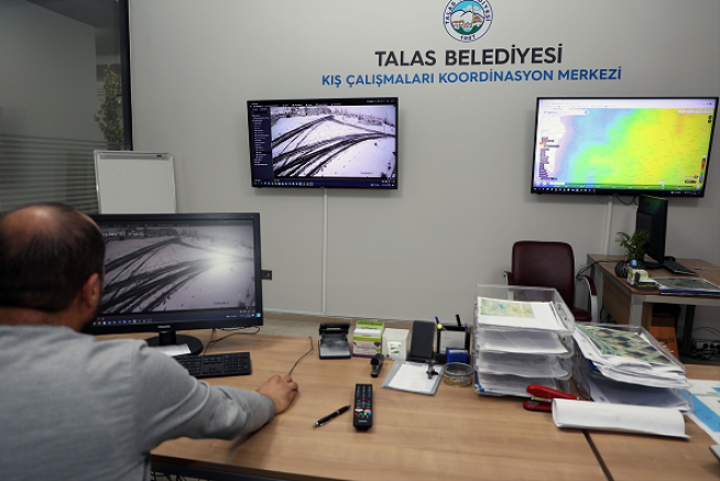 Talas'ın 22 kırsal mahallesini gösteren kameraları izleyen ekipler, ulaşımın aksamaması adına gece gündüz nöbet tutuyor.