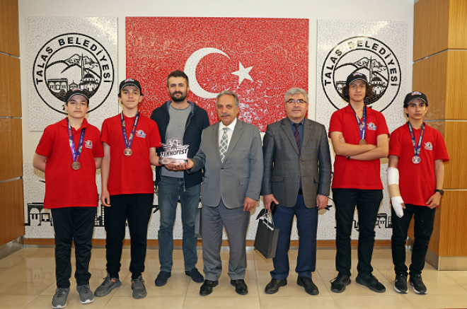 50. Yıl Dedeman Fen ve Teknoloji Anadolu İmam Hatip Lisesi Müdürü Ahmet Oğuz, öğretmen Can Evren Yıldız ve yarışmada dereceye giren öğrenciler Ertuğrulhan Yağmur, Ahmet Taha Demir, Fikri Eren Yıldırım ve Beşir Yasin Kalın, Talas Belediye Başkanı Mustafa Yalçın'ı ziyaret etti.