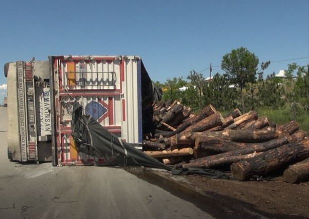 Kırıkkale'de tırın devrilmesi sonucu sürücü yaralandı, araçtaki tomruklar şarampole savruldu.