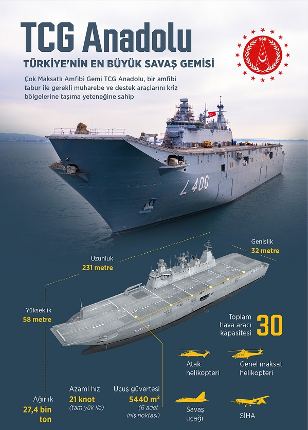 Çok Maksatlı Amfibi Hücum Gemisi (LHD) Projesi kapsamında üretilen TCG Anadolu gemisi, asgari bir tabur büyüklüğündeki kuvveti, ana üs desteği gerektirmeksizin, kendi lojistik desteğiyle belirlenen yere intikal ettirebilecek.