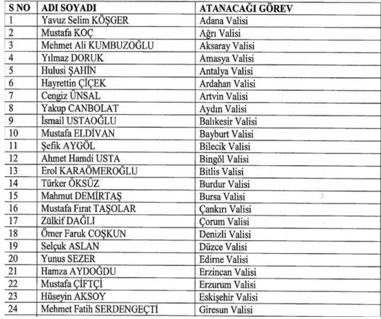 Kararname ile Yavuz Selim Köşger Adana'ya, Mustafa Koç Ağrı'ya, Mehmet Ali Kumbuzoğlu Aksaray'a, Yılmaz Doruk Amasya'ya, Hulusi Şahin Antalya'ya, Hayrettin Çiçek Ardahan'a, Cengiz Ünsal Artvin'e, Yakup Canbolat Aydın'a, İsmail Ustaoğlu Balıkesir'e, Mustafa Eldivan Bayburt'a, Şefik Aygöl Bilecik'e, Ahmet Hamdi Usta Bingöl'e, Erol Karaömeroğlu Bitlis'e, Türker Öksüz Burdur'a, Mahmut Demirtaş Bursa'ya, Mustafa Fırat Taşolar Çankırı'ya, Zülkif Dağlı Çorum'a, Ömer Faruk Coşkun Denizli'ye, Selçuk Aslan Düzce'ye, Yunus Sezer Edirne'ye, Hamza Aydoğdu Erzincan'a, Mustafa Çiftçi Erzurum'a, Hüseyin Aksoy Eskişehir'e, Mehmet Fatih Serdengeçti Giresun'a, Alper Tanrısever Gümüşhane'ye, Ali Çelik Hakkari'ye, Ercan Turan Iğdır'a, Süleyman Elban İzmir'e, Mükerrem Ünlüer Kahramanmaraş'a, Mustafa Yavuz Karabük'e, Hüseyin Engin Sarıibrahim Karaman'a, Ziya Polat Kars'a, Meftun Dallı Kastamonu'ya, Mehmet Makas Kırıkkale'ye, Tahir Şahin Kilis'e, Musa Işın Kütahya'ya, Ersin Yazıcı Malatya'ya, Enver Ünlü Manisa'ya, Tuncay Akkoyun Mardin'e, İdris Akbıyık Muğla'ya, Avni Çakır Muş'a, Ali Fidan Nevşehir'e, Cahit Çelik Niğde'ye, Muammer Erol Ordu'ya, İhsan Selim Baydaş Rize'ye, Yaşar Karadeniz Sakarya'ya, Orhan Tavlı Samsun'a, Kemal Kızılkaya Siirt'e, Mustafa Özarslan Sinop'a, Hasan Şıldak Şanlıurfa'ya, Cevdet Atay Şırnak'a, Recep Soytürk Tekirdağ'a, Aziz Yıldırım Trabzon'a, Bülent Tekbıyıkoğlu Tunceli'ye, Hülya Kaya Yalova'ya, Mehmet Ali Özkan Yozgat'a, Osman Hacıbektaşoğlu Zonguldak'a vali oldu.
