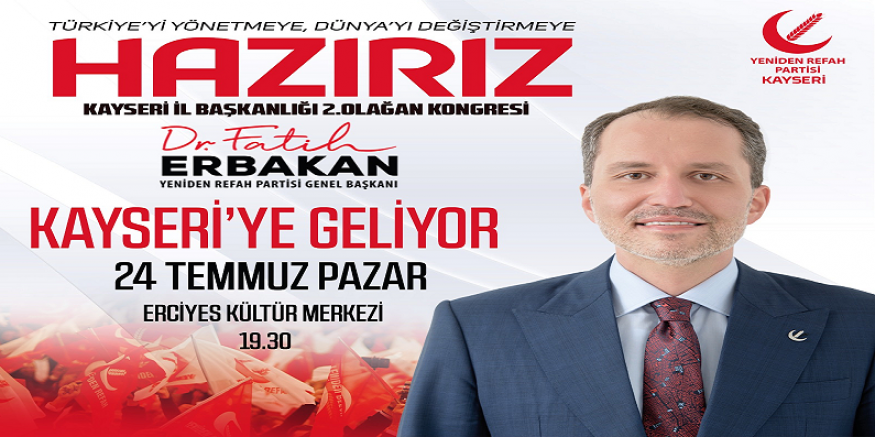 Kongre hazırlıkları kapsamında Erciyes Kültür Merkezi ile anlaşan Yeniden Refah Partisi Kayseri İl Başkanlığı salonu doldurarak gövde gösterisi yapmayı amaçlıyor. 24 Temmuzda yapılacak kongreye Yeniden Refah Partisi Genel Başkanı Dr Fatih Erbakan ında katılacağı ifade ediliyor. Her şehrin en