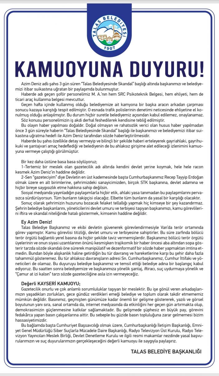 Bu olayın haber yapılması doğaldır. Doğal olmayan ve rahatsızlık verici olan husus haber yapılmadan önce 3 gün süreyle haberin “Talas Belediyesinde Skandal” başlığı ile başkanımızı ve belediyemizi itibar suikastına uğratma hedefi ile Azim Deniz tarafından sözde haberleştirilmesidir.